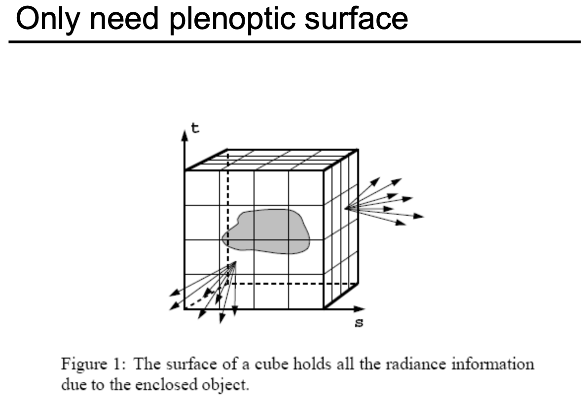 可以简化一点,我们不需要知道光场表示的是什么东西,我们只需要知道盒子上表面任意一个点往任意一个方向(观测点)发出的光的强度(前提是观测点不在盒子内部)。