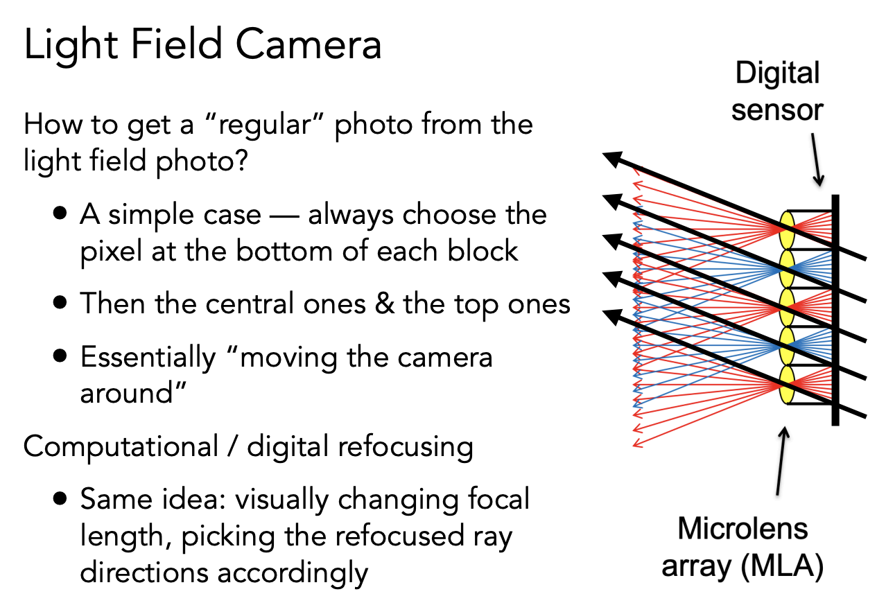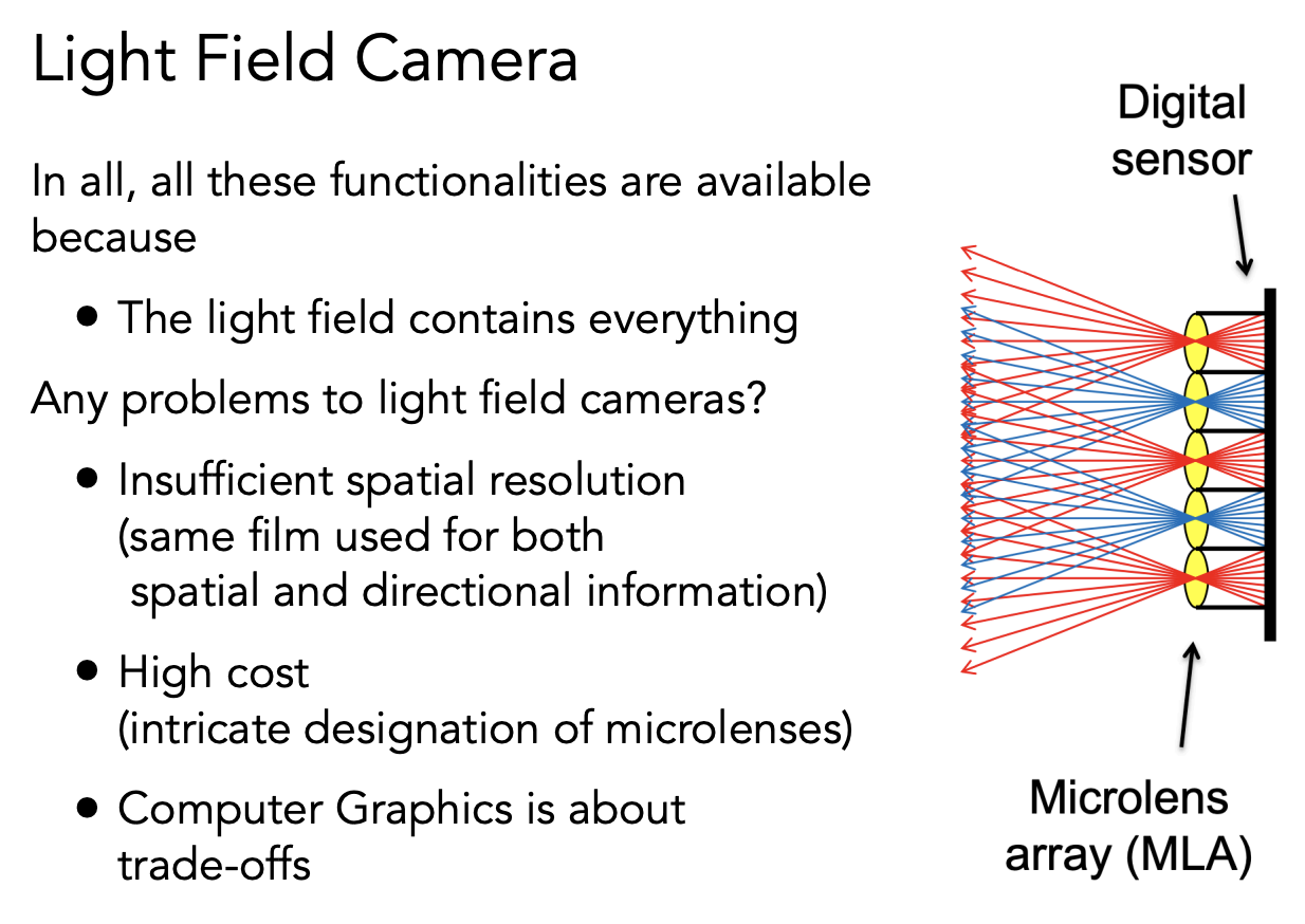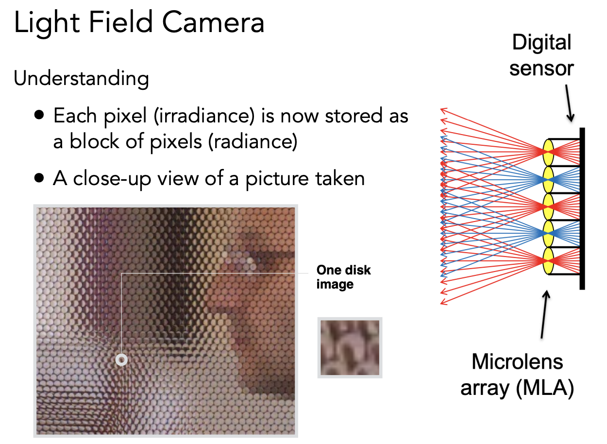 光场相机就是用透镜把光分开,一个像素的 irradiance 现在分开记录到一块区域上的 radiance。