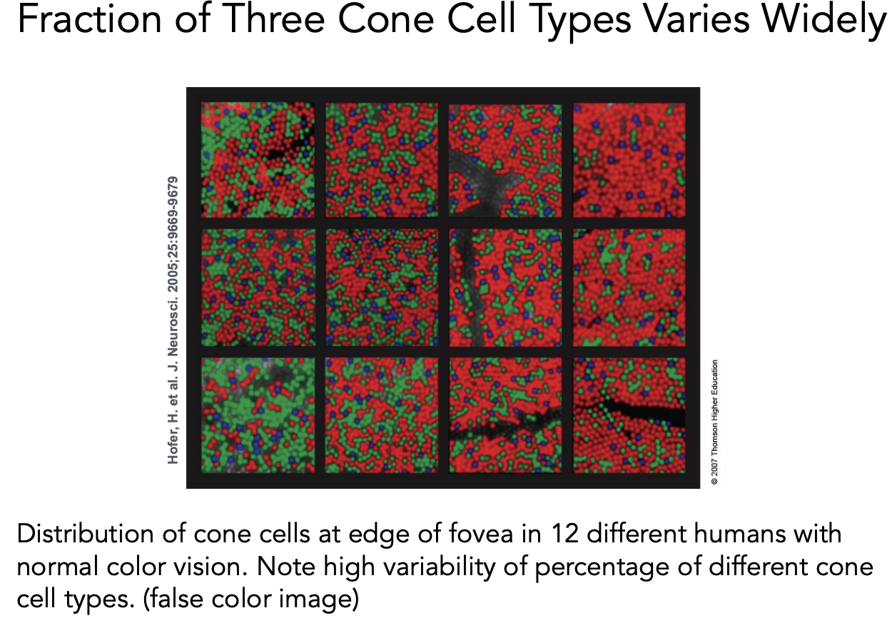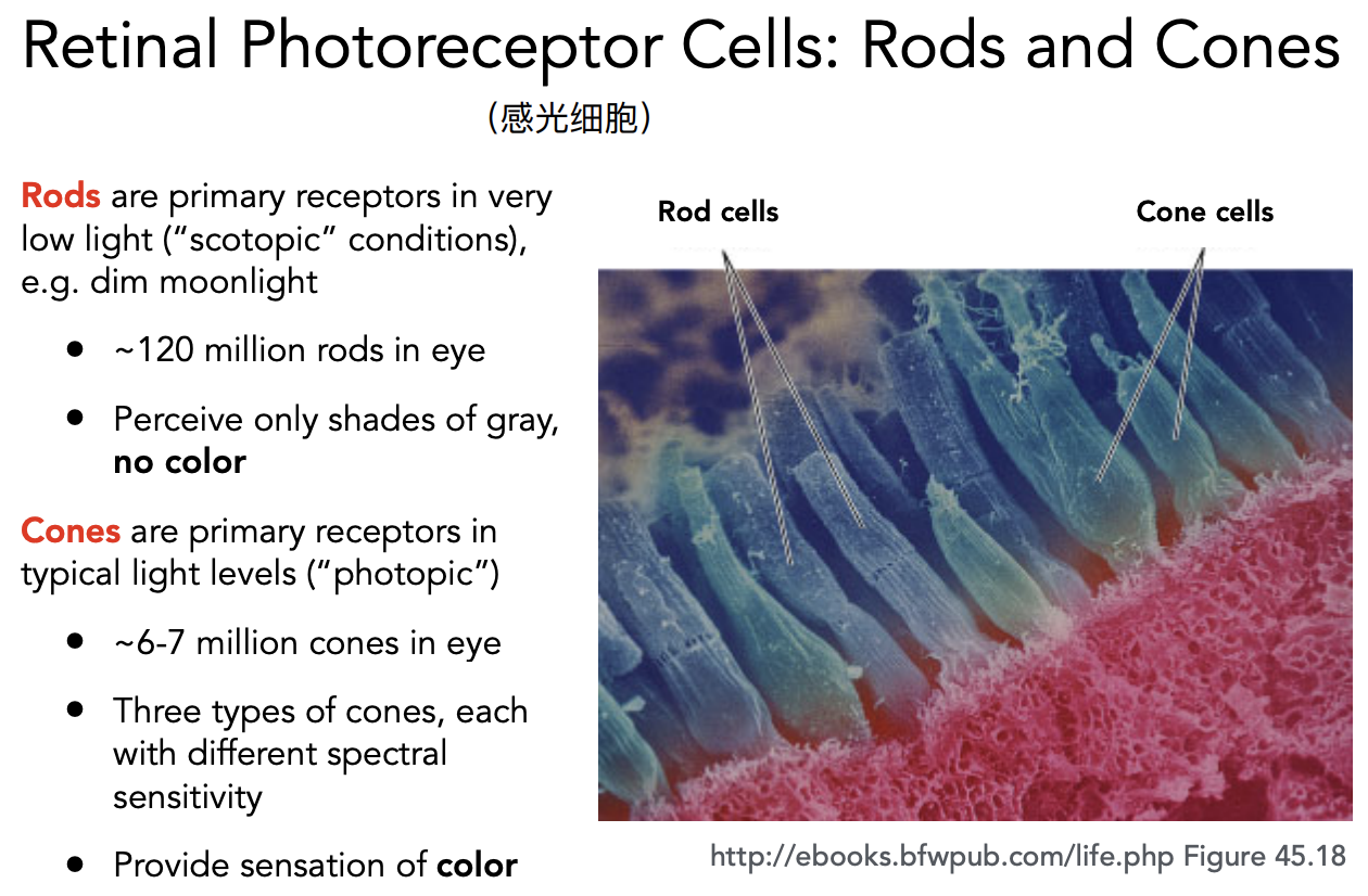 Cones 锥形细胞,感知颜色。锥形细胞内部又分成三种不同的锥形细胞(S,M,L),感应不同范围的波长。