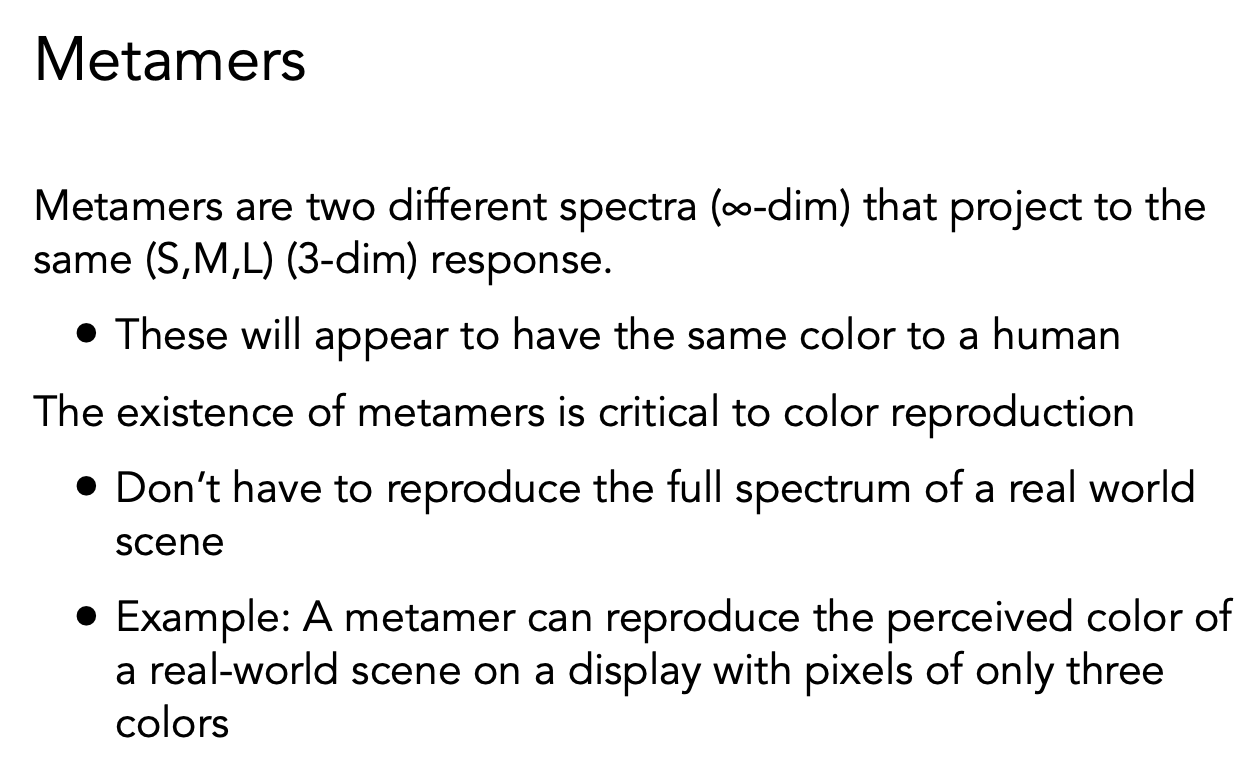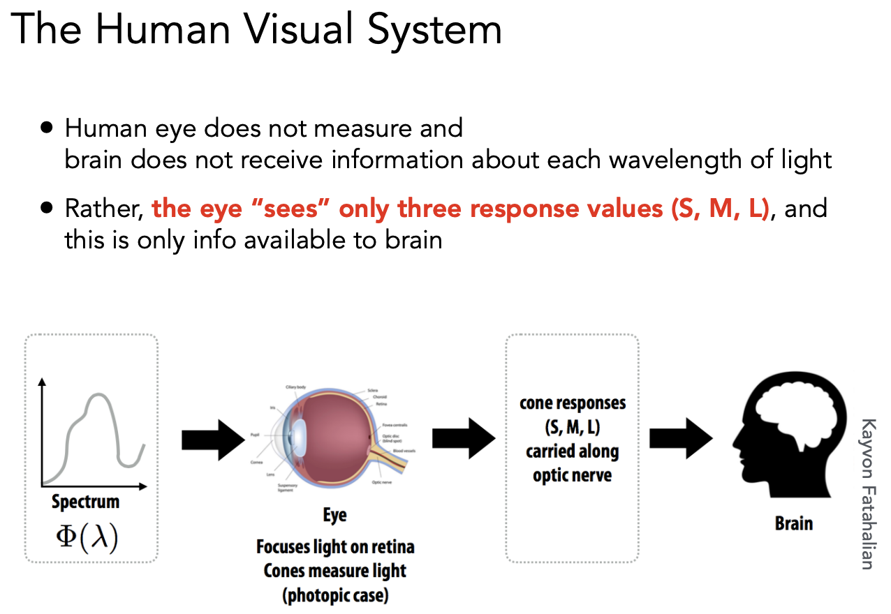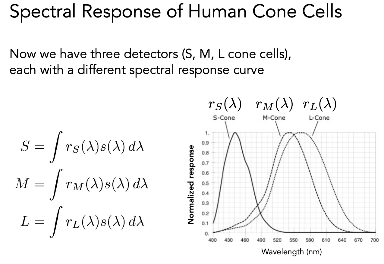 把响应曲线和感应到的 SPD 做积分,得到三个数 S、M、L,就是人感知到的颜色,而不是光本身的 SPD。