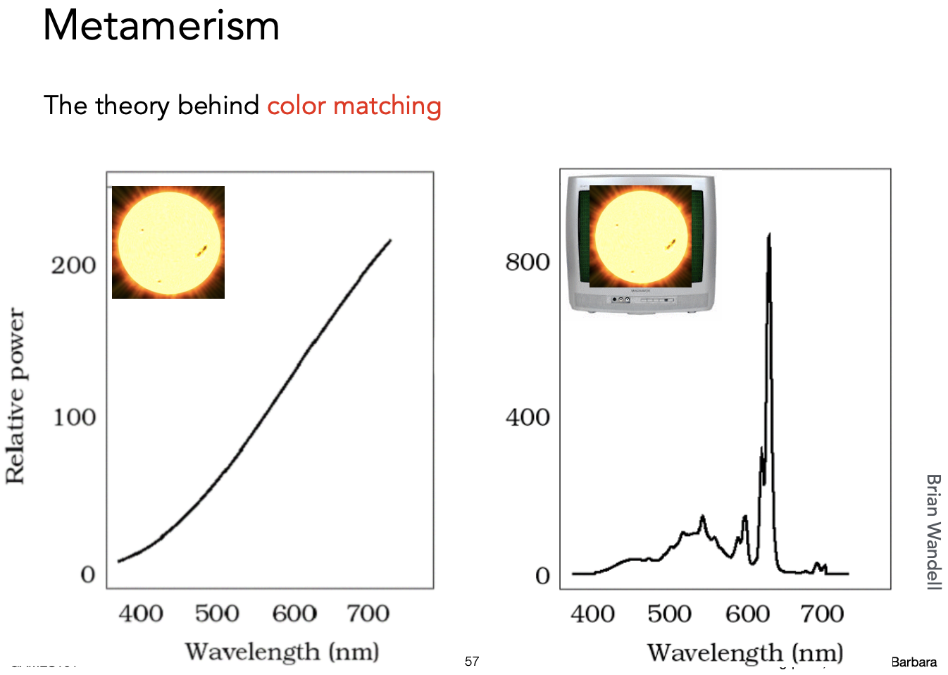 比如在显示器上显示一个太阳,混合的光谱可以和真实的完全不一样,但最后的颜色是一样的: