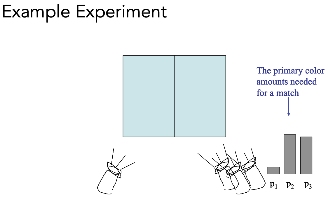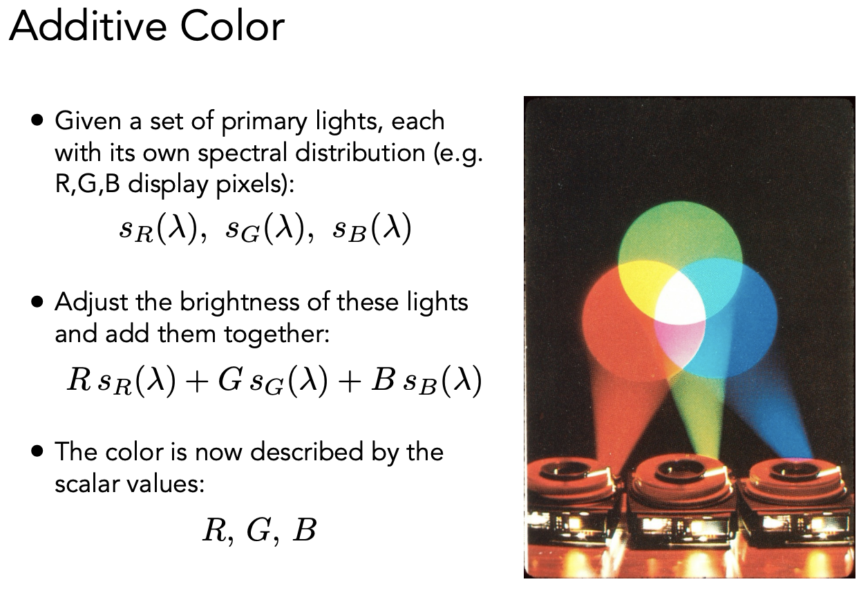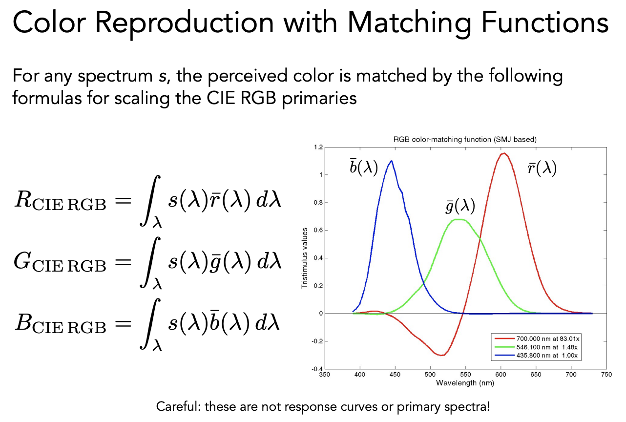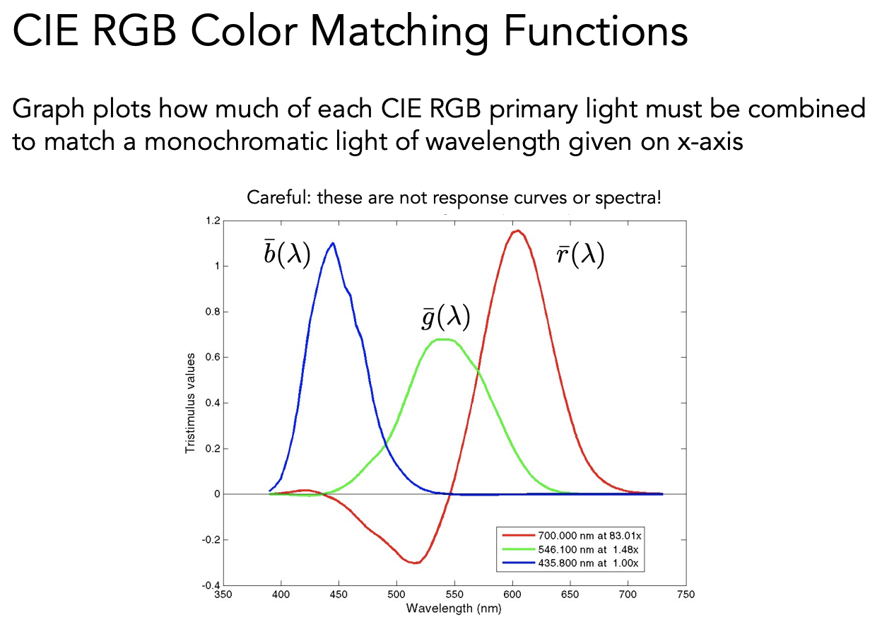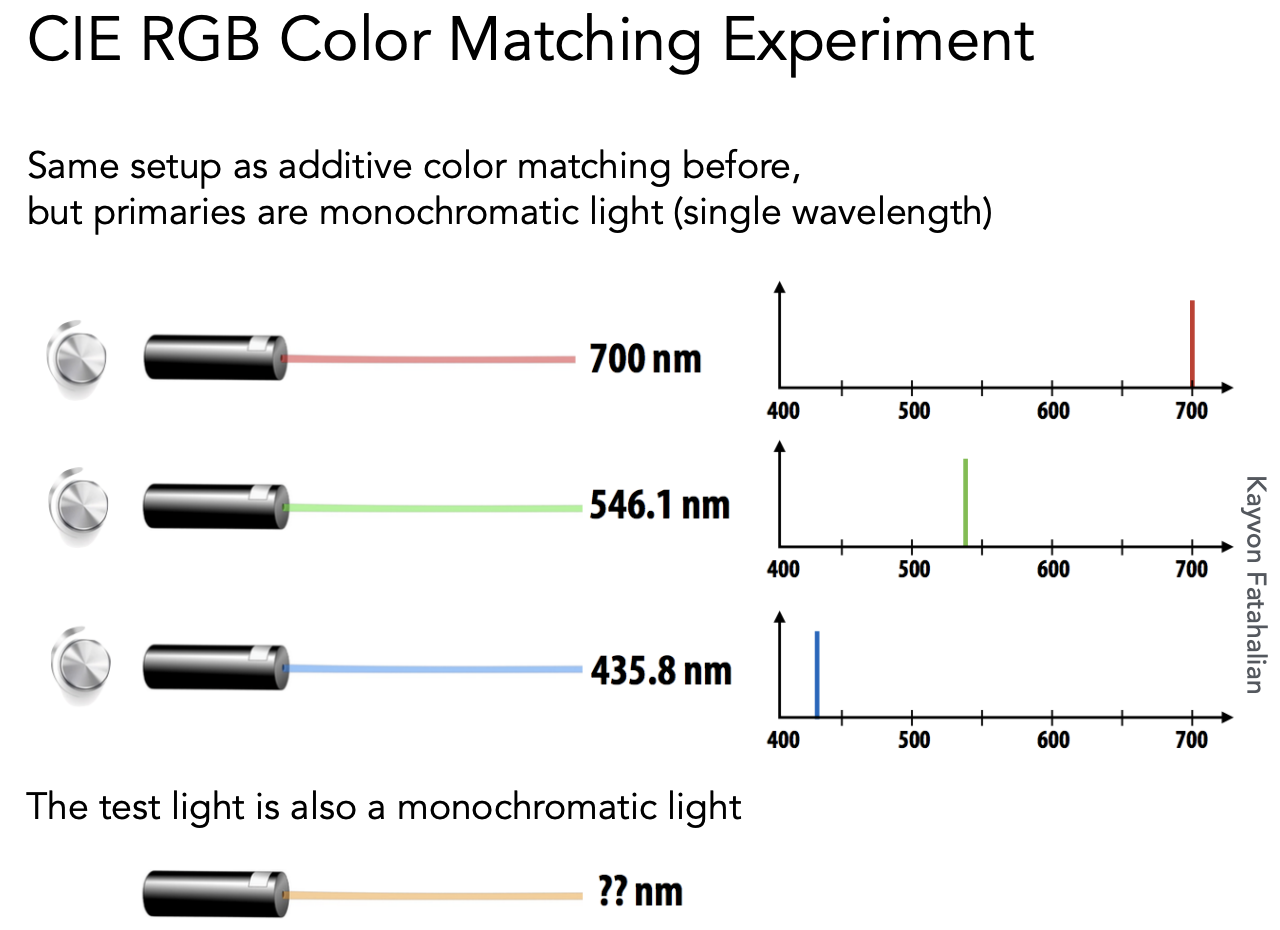 给任何一种实际光的光谱,把每个波长需要多少 R、G、B 都算出来,然后做积分把颜色表示出来