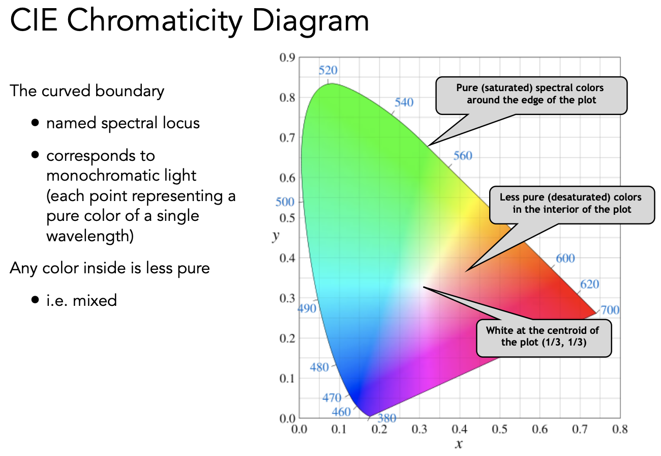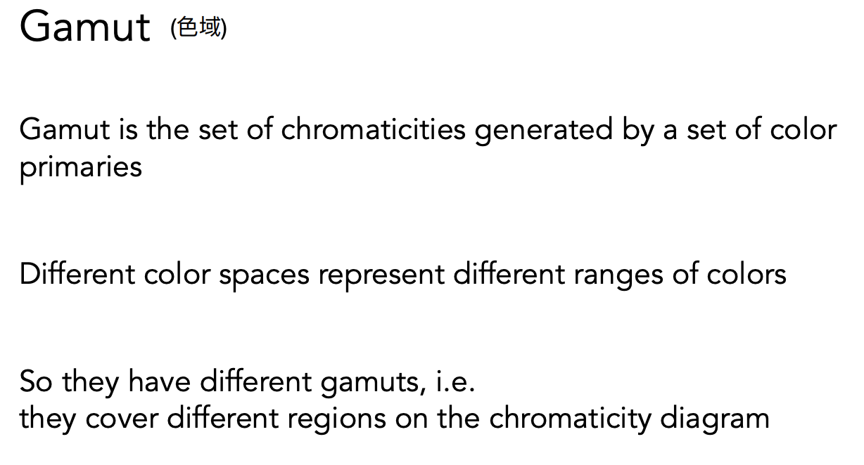 可视化 XYZ 系统得到的所有颜色,但是三维的不好显示,所以把 X、Y、Z 做归一化处理,Y 表示亮度,所以把 Y 固定成某一个数,让 X、Z 发生变化,显示的图显示小写的(x, y),看到的形状就叫做色域。