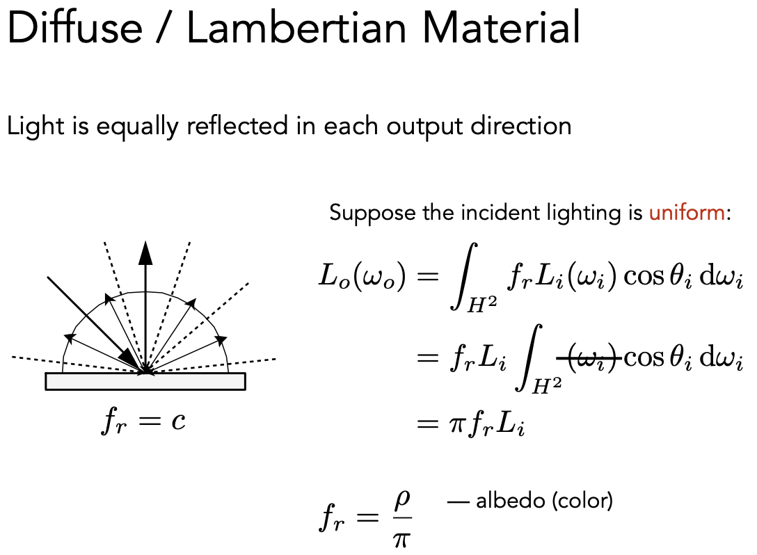 假设空间中任何一个方向进来的光的 radiance 的一样的,它反射的光也是一样的。根据能量守恒,如果一个点不发光也不吸收光,那么进来多少就应该反射多少。