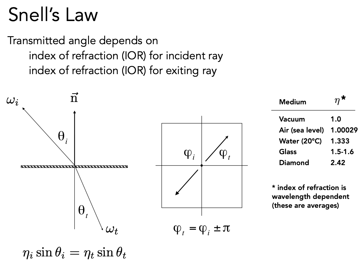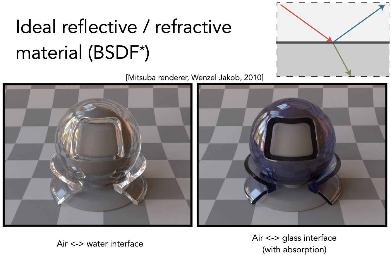 折射的 BRDF 就叫做 BTDF,T 表示 transmission。BRDF 和 BTDF 统称 BSDF,S(scaterring)表示散射。
