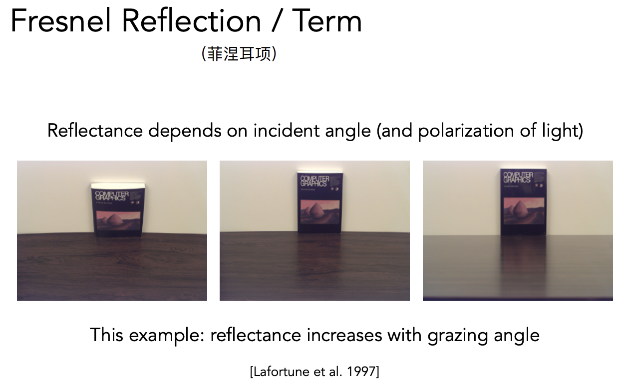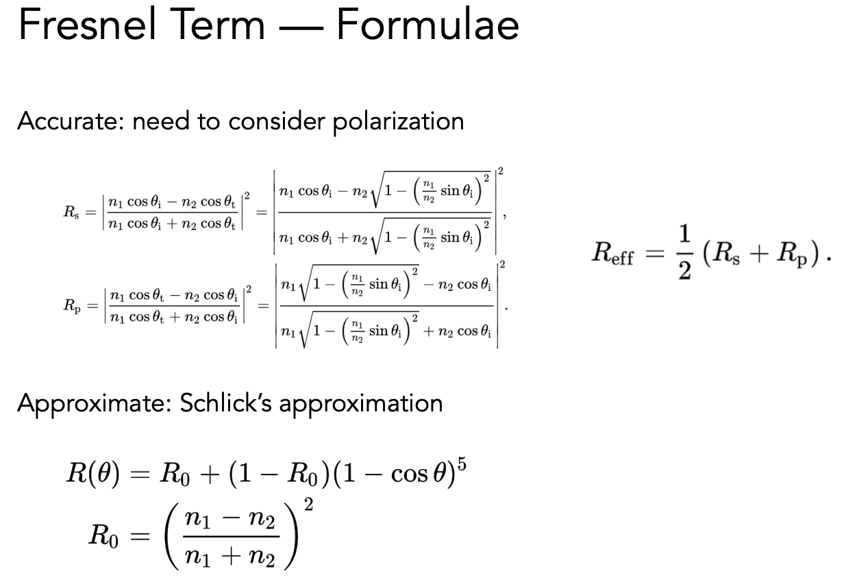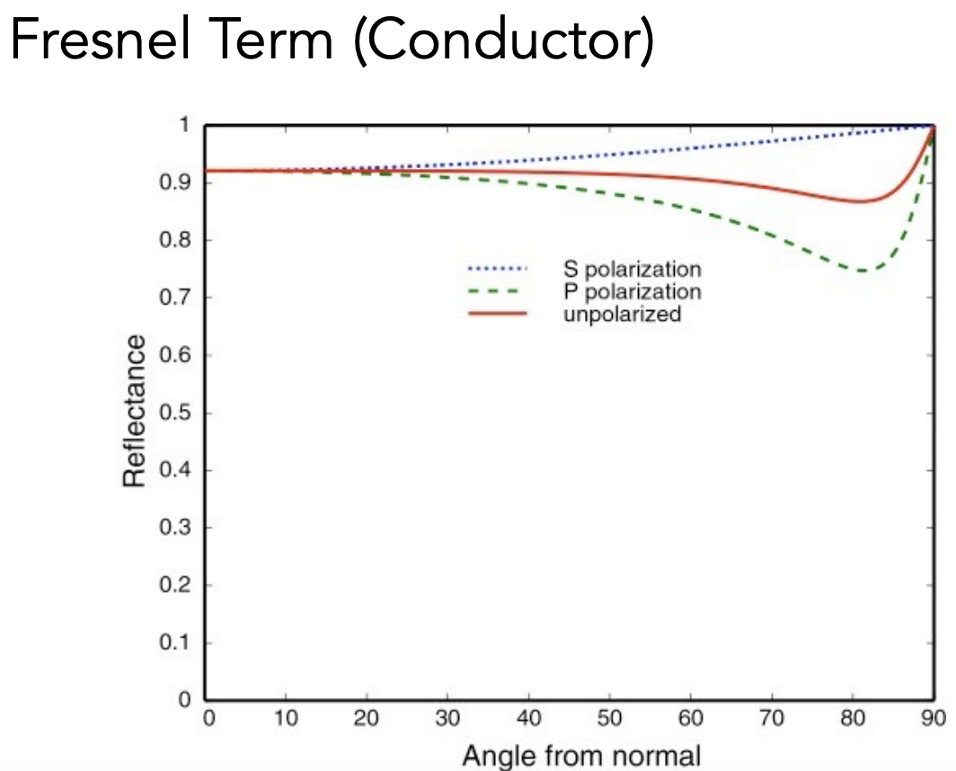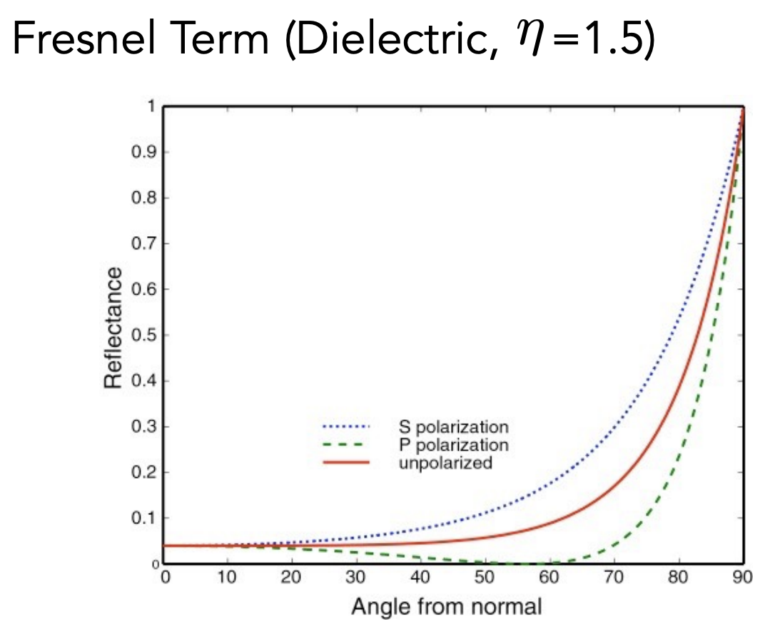 菲涅尔项表示有多少光线被反射、多少被折射。 图中的虚线表示极化现象下的光,极化现象即光只沿某一个方向振动。