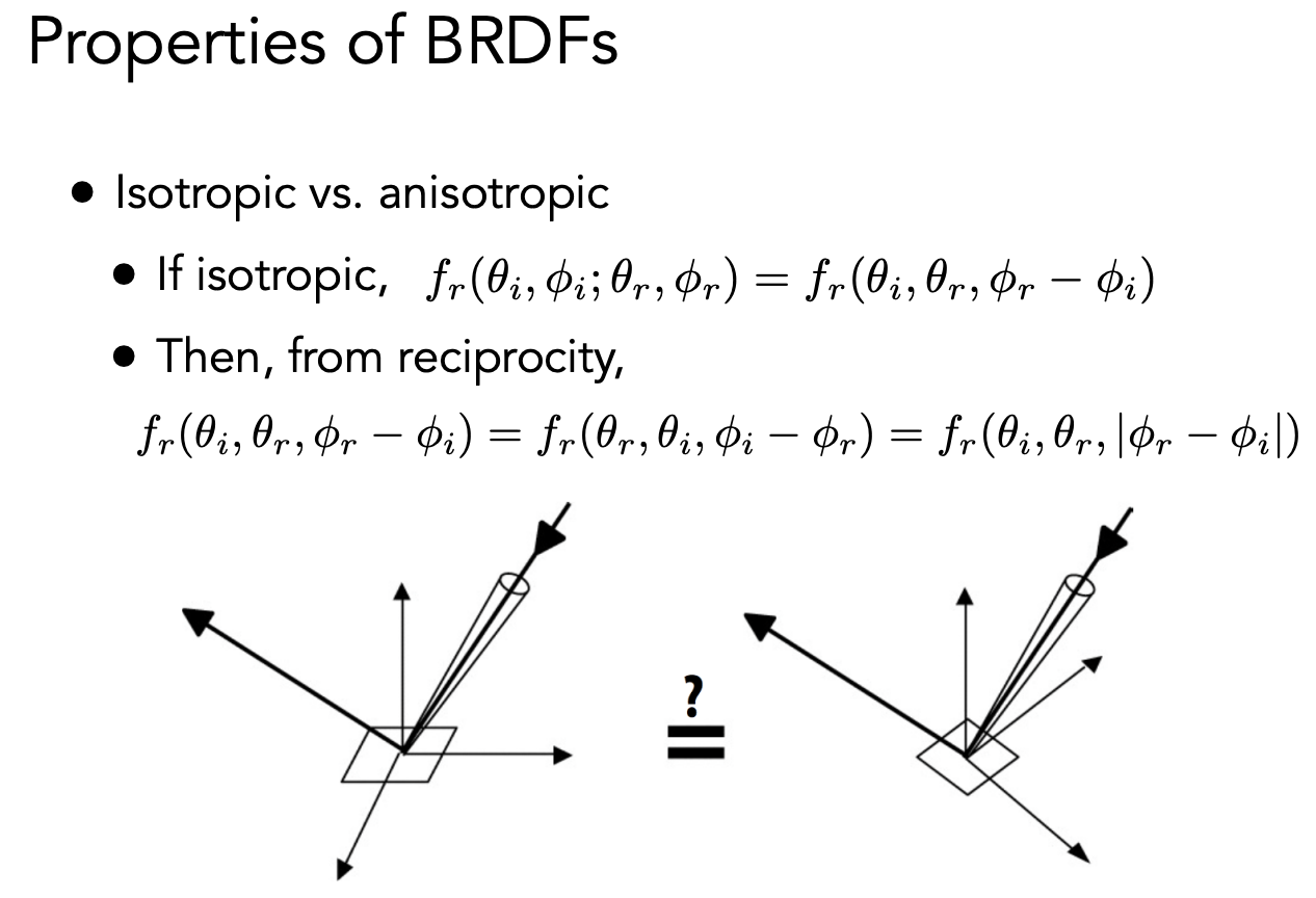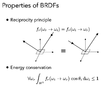 3.可逆性。交换入射和出射方向的角色,得到的 BRDF 是一样的