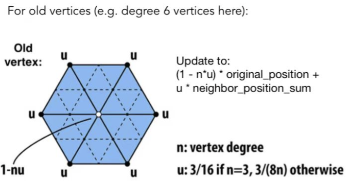 老的点用原本的点位置和相连三角形的顶点位置再加上度做加权平均。