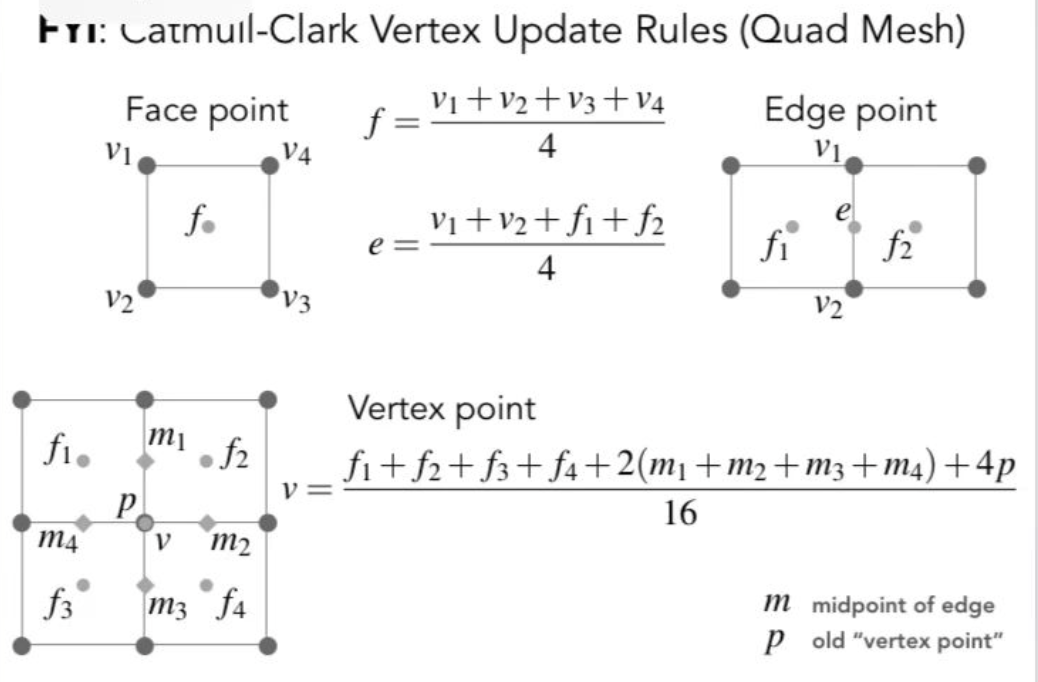 老的点用它原本的位置和新的面中心点、边中心点做加权平均。