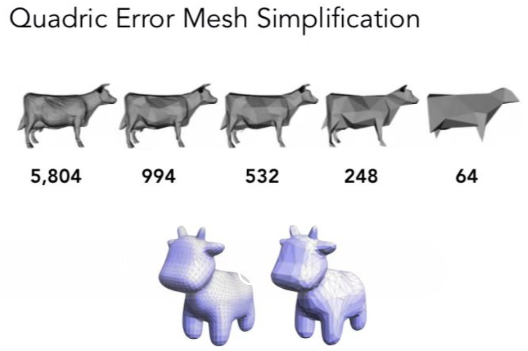 越简单越接近平面的面坍缩得越多(计算出来的二次度量误差越小),比如下图中的小奶牛的面部坍缩的多,但是颈部坍缩的少
