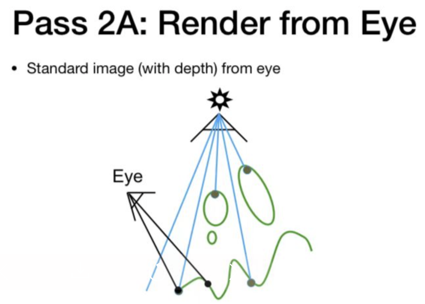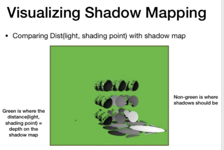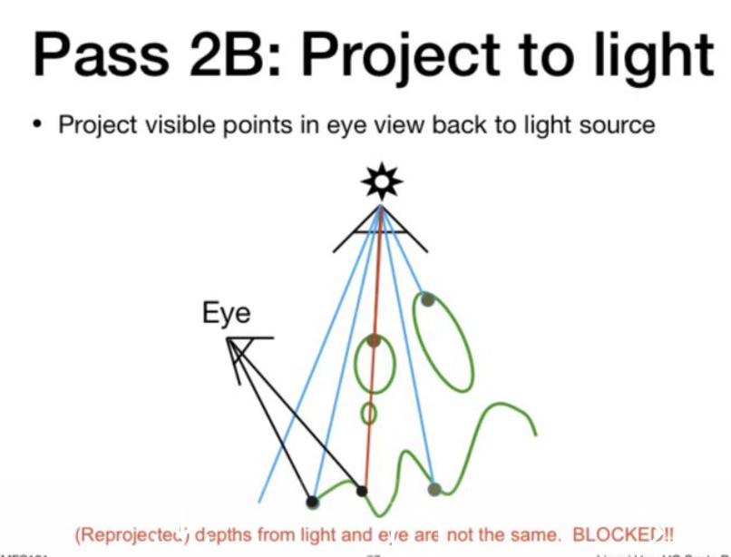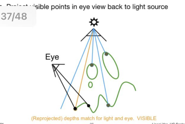 再从摄像机出发看向场景。把看到的点投影回光源,就知道之前记录到深度图上的深度。把记录的深度图深度和眼睛看到的点到光源的实际深度比较,如果二者一致,说明这个点一定即可以被光源看到,又可以被摄像机看到。