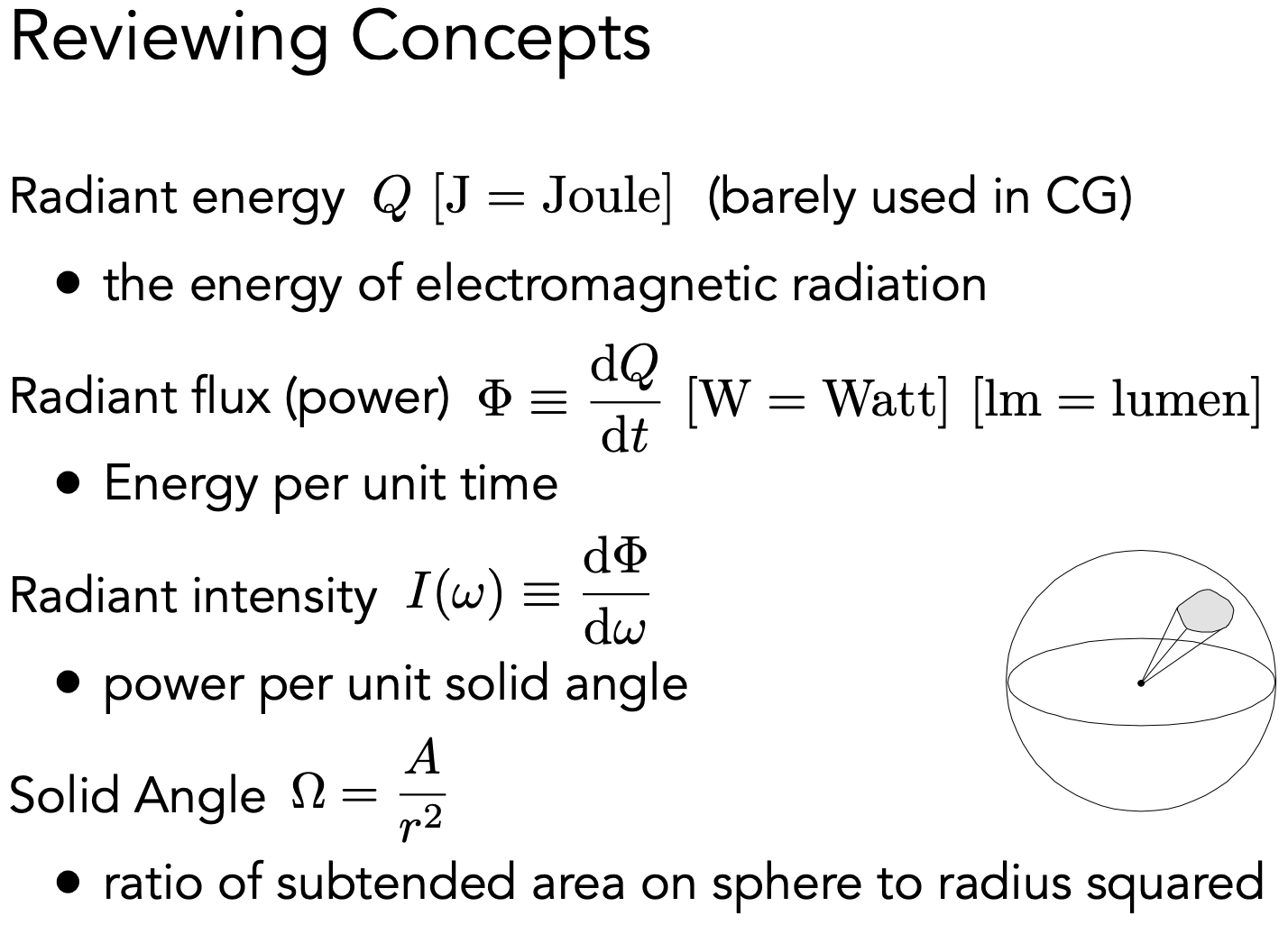 我们考虑光照都是用瞬时量,因为物体一般接受能量一边也在辐射能量,有一些荧光的材质可能收到光线时间长短影响有不同的颜色,这种情况先不考虑。