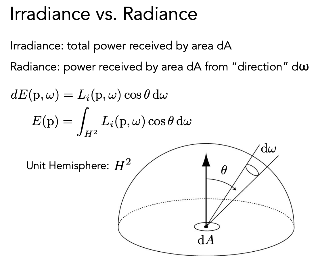 irradiance 和 radiance 的区别:是否有方向性。radiance 可以理解为单位面积上某个方向接受到的能量。