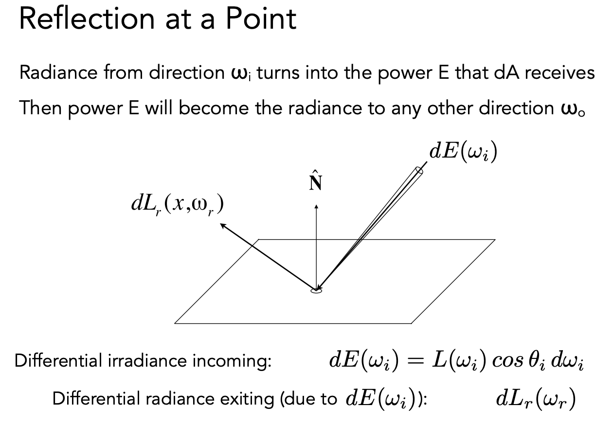 dE(ω_(i))表示 dA 在一个方向上的单位立体角接收到的能量,dL_(r)(ω_(i))表示一个比率:dA 上任何一个出射方向算出来的 radiance 除以 dA 接收到的 irradiance。