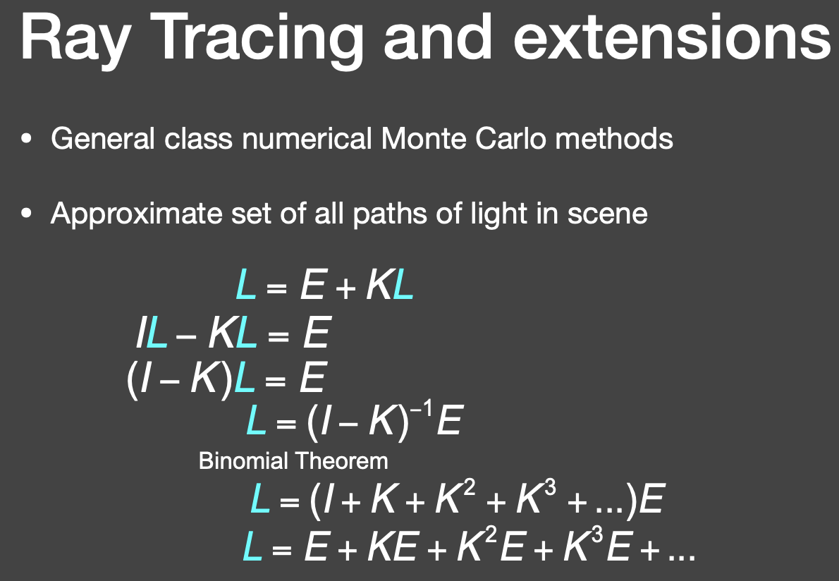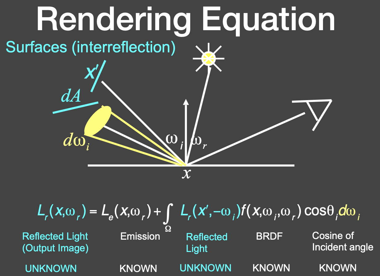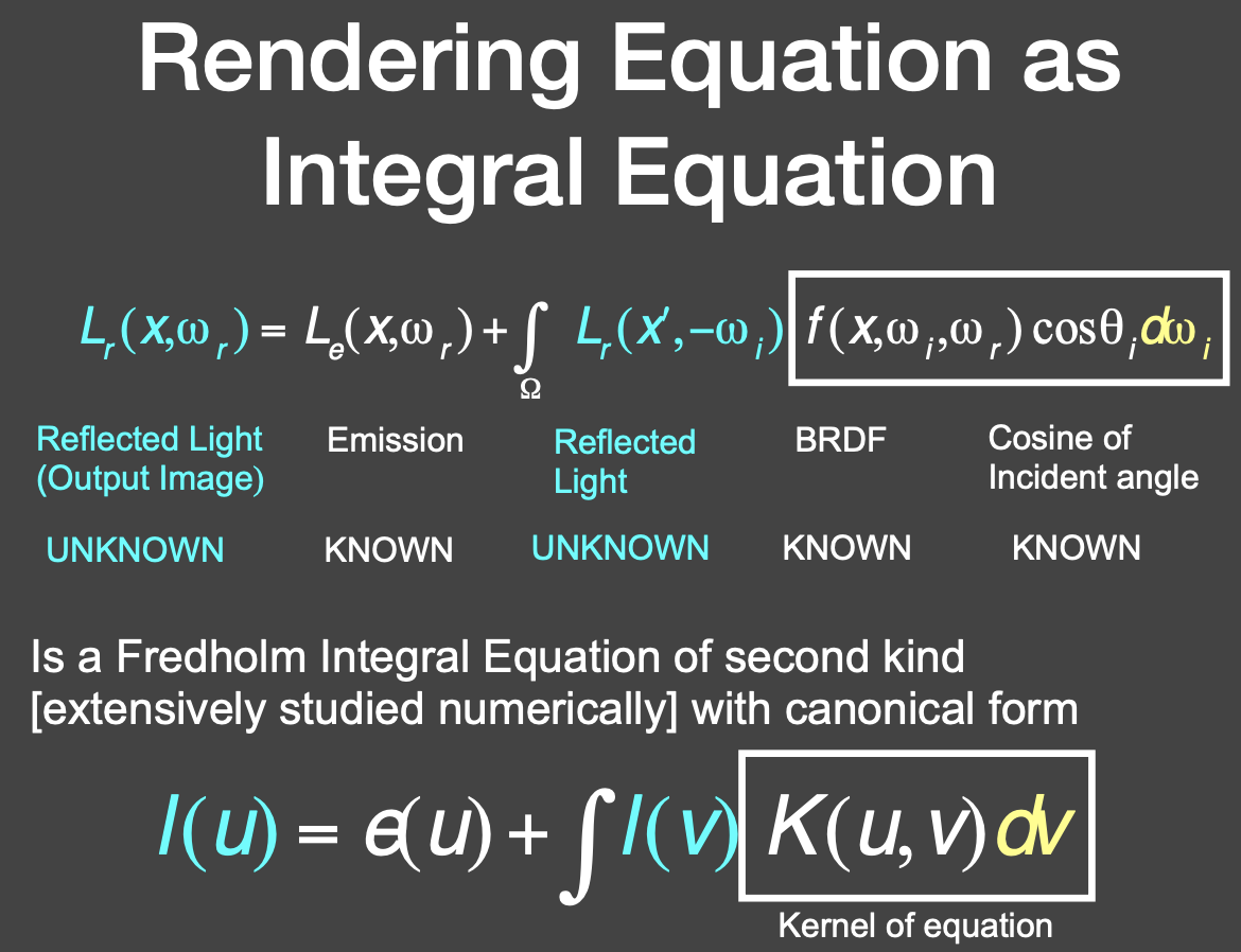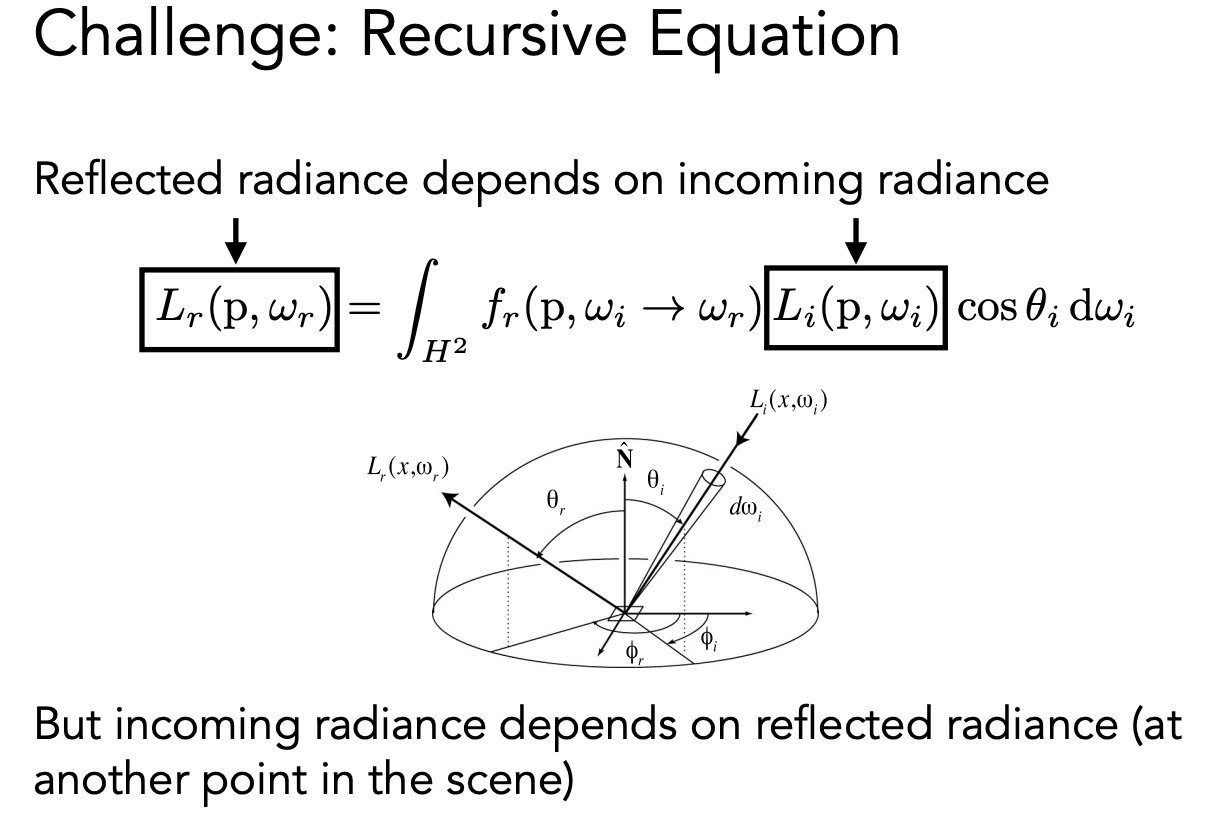 光线会弹射多次,任何出射的 radiance 都有可能成为入射的 radiance,所以是一个递归的问题。