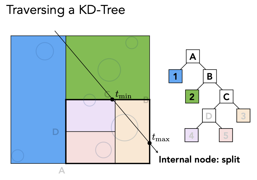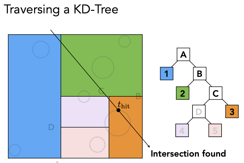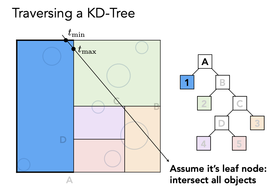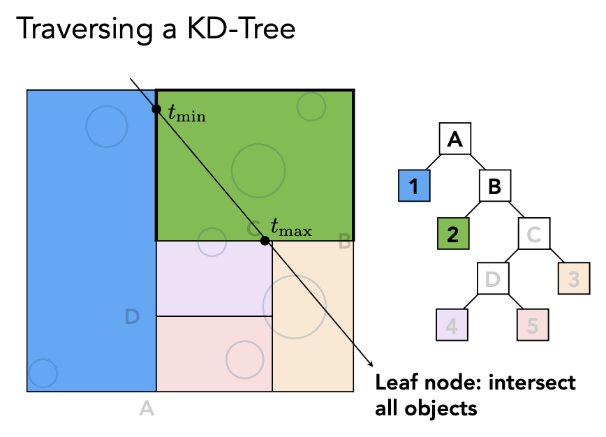 判断光线和当前节点是不是有交点,如果有交点,继续判断和当前节点的子节点是不是有交点,一直到叶子节点,如果光线和叶子节点有交点,就求光线和叶子节点里面所有物体的交点;如果光线和当前节点没有交点就不需要继续往下找。