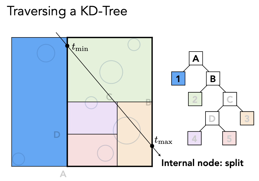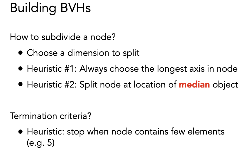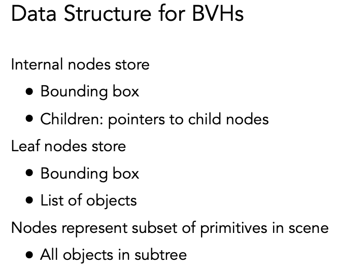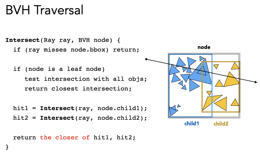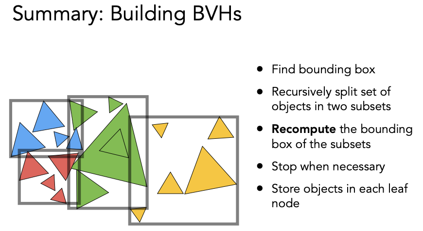 BVH 的好处是:一个物体只可能出现在一个盒子里,且无需求三角形和包围盒的交点,避免了 KD-Tree 的问题。