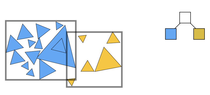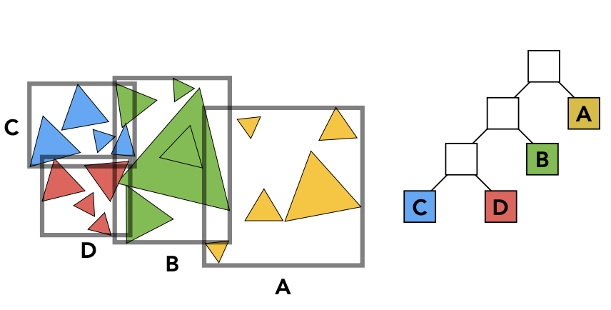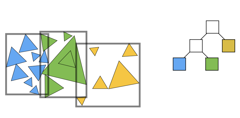 划分物体:把一个盒子里的三角形分为两部分,把两部分的三角形再重新求包围盒,然后每个包围盒继续划分,直到一个包围盒里包含的节点数够少就停止划分。