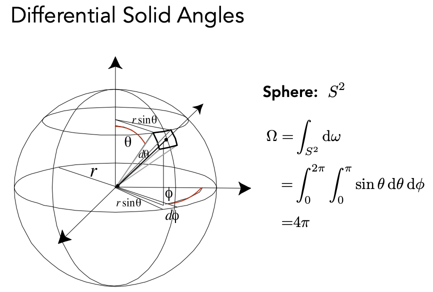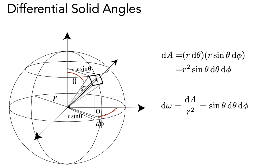 在辐射度量里面通常用 ω 表示方向,ω 可以用 θ 和 φ 来定义位置,并通过 sinθdθdφ 算出单位立体角。