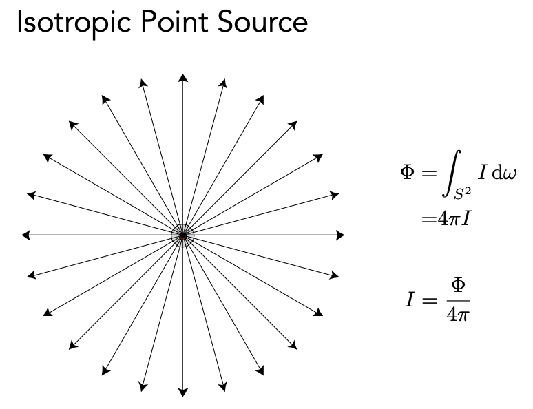 对一个点光源,radiant intensity 是单位立体角的能量,把所有方向上的单位立体角的 intensity 积分,就可以得到它的 power,反之任何一个方向的 Intensity 就是 power/4π。