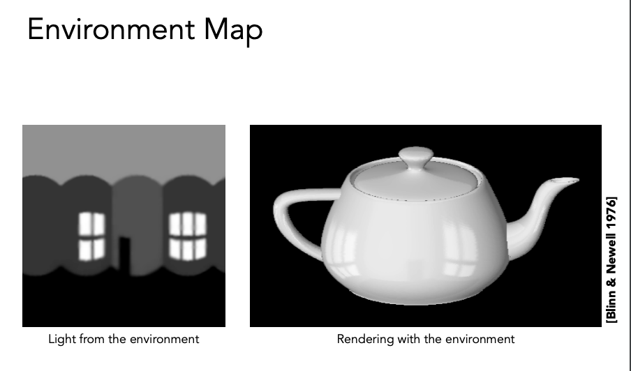 把任何一个方向来的光都记录下来,用纹理描述环境光,用环境光渲染其他物体。假设环境光源都是来自无限远处,不考虑位置。 犹他茶壶