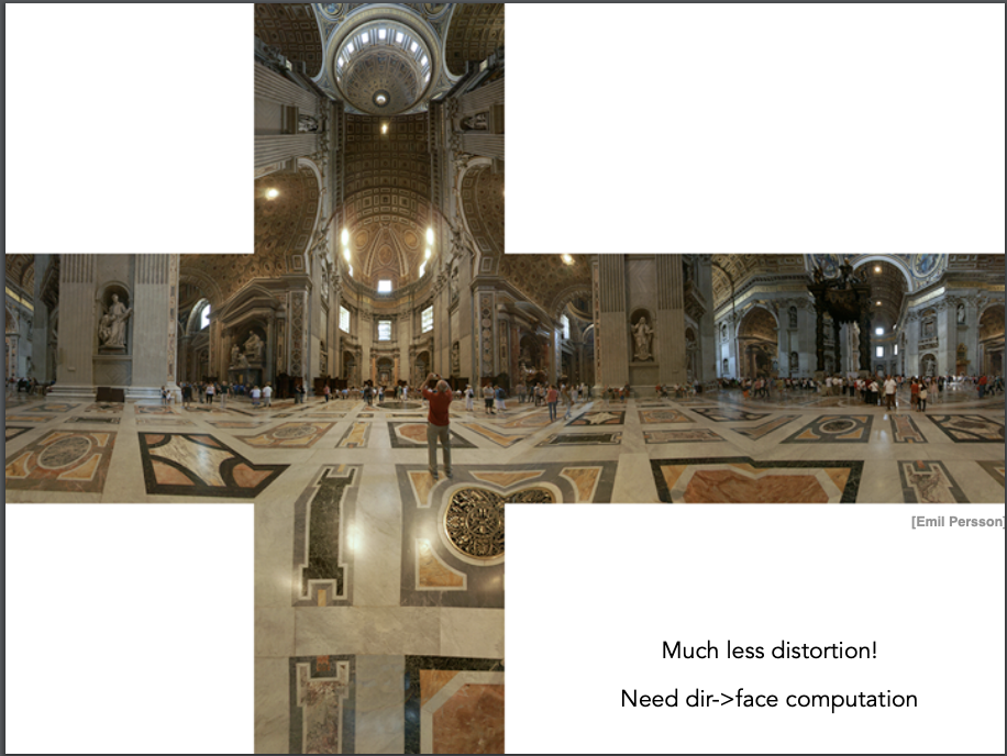 此时可以假设球外面有一个包围盒,把球心到球表面的连线延长到立方体上,把环境光信息记录在一个立方体上对应的 6 个面上,再把立方体展开: