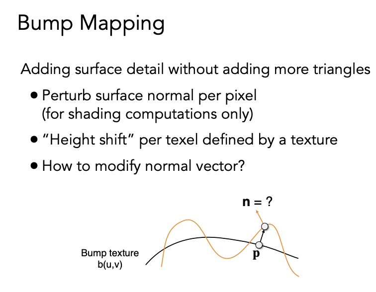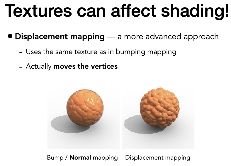 凹凸贴图没有真正改变顶点的高度,在边缘和自己的几何会产生自己的阴影的情况下表现失真,这个时候用位移贴图,真正改变三角形顶点的高度。问题就是三角形需要定义得足够细,能跟上纹理定义的频率。