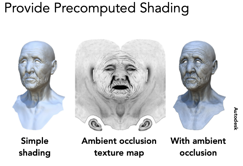 先计算环境光遮蔽写进纹理图,再把纹理图乘以着色的结果,得到阴影。