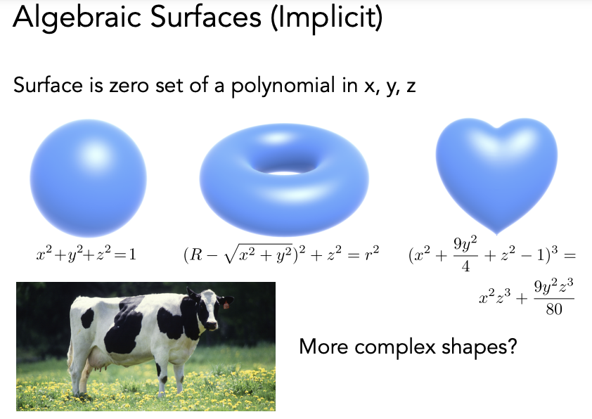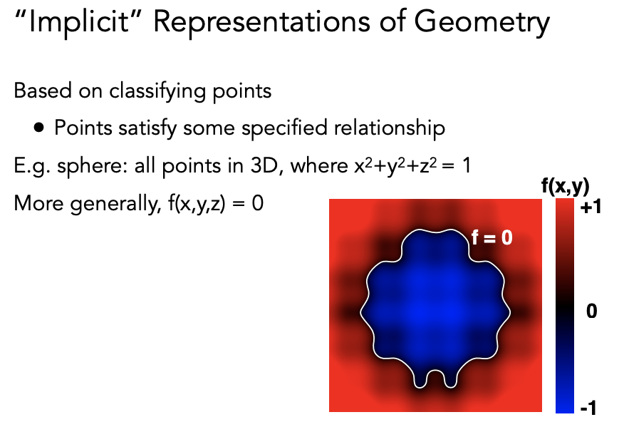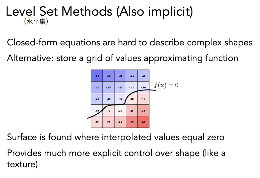 优点: 隐式函数表示起来比较容易,对存储也比较友好,比较容易判断是否在物体表面。用隐式函数表示的表面很容易对光线求交。严格地表示简单形体,很容易给出准确描述。很适合描述拓扑结构。 缺点: 对复杂的模型很难用一个规则的函数来描述。