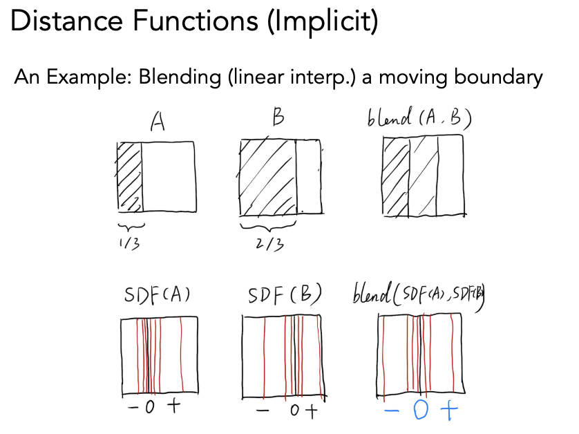 对两个几何做融合(blend)得到 A→B 从左到右运动的一个中间状态。blend 两个几何的距离函数,其实就是 blend 两个边界。可以通过 blend 出来的结果距离函数,还原出边界(SDF 为 0)。