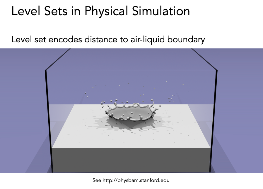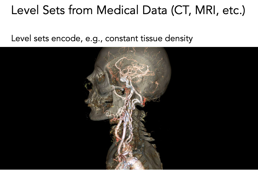 水平集也可以定义在三维上。比如计算三维中 f(x)等于某一个值的所有点,可以得到一个三维空间中的一个表面。