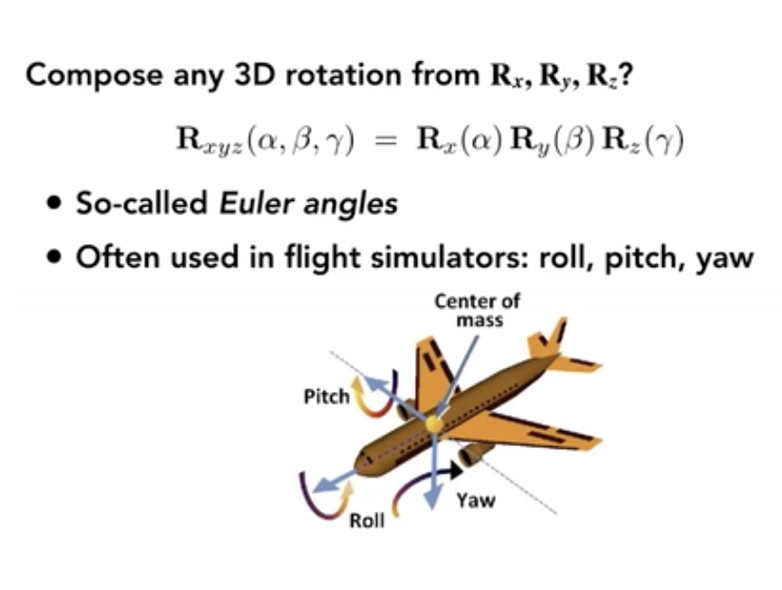 绕任意轴旋转:先平移,让旋转轴位于原点,再旋转,再平移回来。 四元数:解决插值问题。比如二维旋转 20 度的矩阵和旋转 30 度的矩阵相加后除以 2,不等于旋转 25 度的旋转矩阵,需要用到四元数做旋转和旋转间的插值。