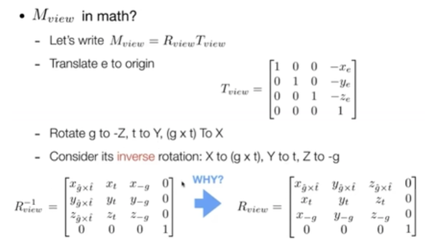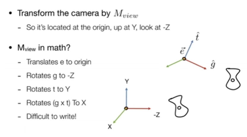 正交矩阵的逆就是它的转置。 先把中心移动到原点再做旋转的到的变换就是视图变换。相机通过这种变换变换到一个固定位置,其他物体也做一样的变换,保持和相机的相对位置不变。 总结: