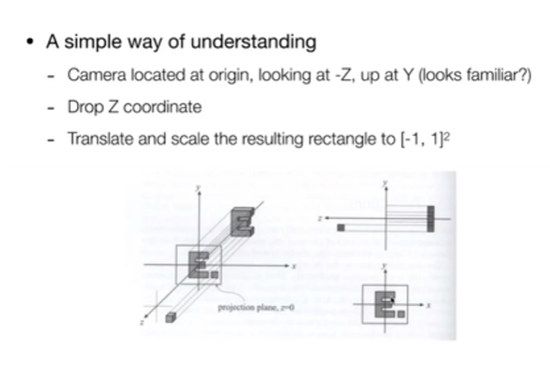 相机移到原点,把 z 轴扔掉(怎么区分物体前后后面再说),所有东西都在(x,y)上,然后把范围约束到[-1,1]² 这样的一个矩形里(约定俗成),得到正交投影的结果。