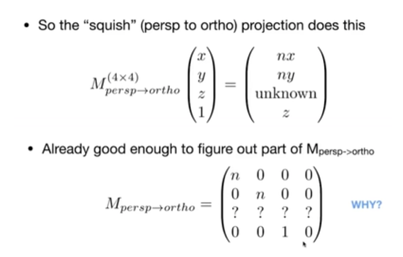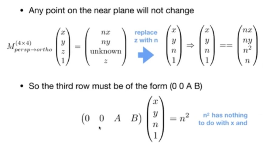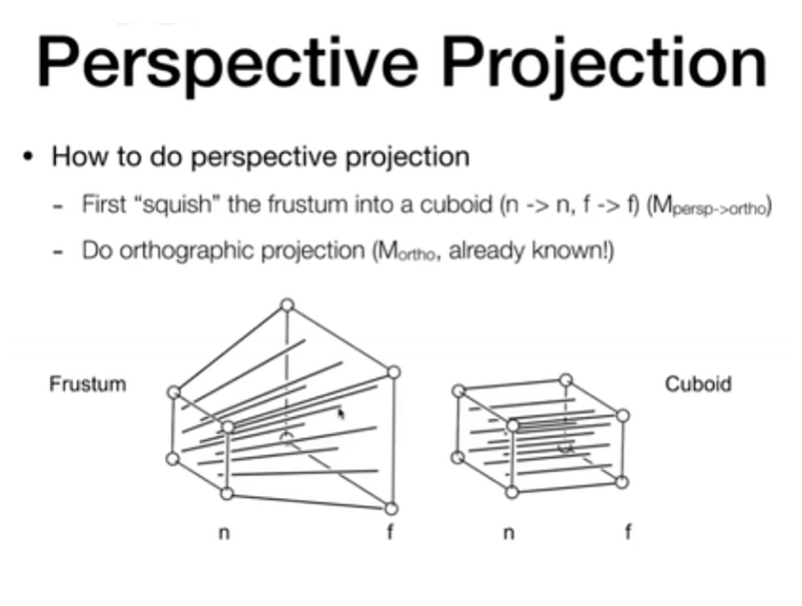 先把锥体向内挤压成一个立方体,约定近面和远面的 z 轴不变,远面中心点不变,近面大小不变(从透视到正交)。