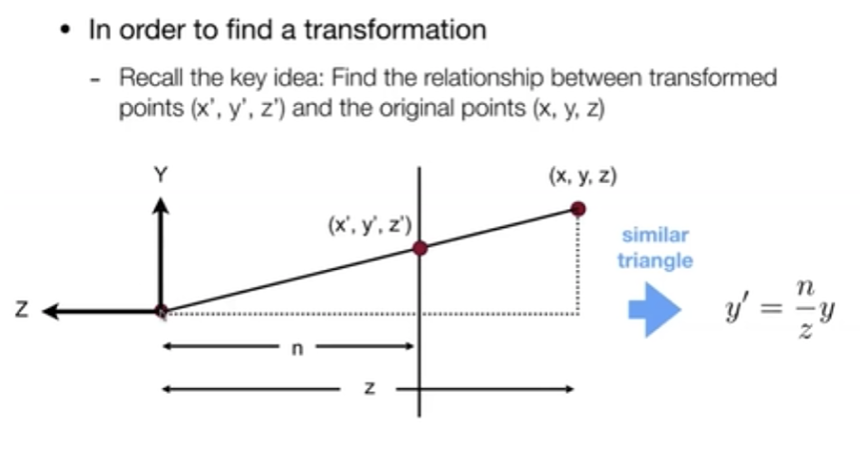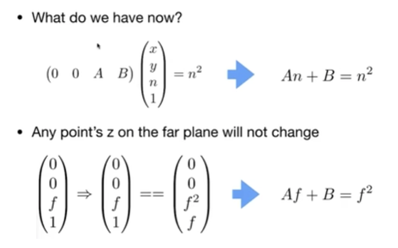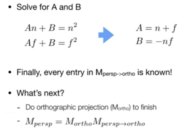 这里用的是右手系,z 方向向外,面离我们更远则 z 值更小,离我们更近则 z 值越大,所以 f 小于 n。所以有一些图形学的 API(比如 OpenGL 从透视空间到裁剪空间,webgl 也是类似)会用左手系,让 z 方向朝里。